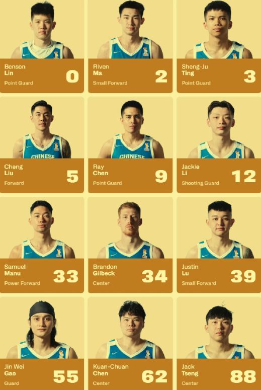 中國臺北男籃的球員名單分別是林庭謙、陳盈駿、劉錚、游艾喆、丁圣儒、李家慷、雷蒙恩、高柏鎧、盧峻翔、高錦瑋、陳冠全和曾翔鈞。