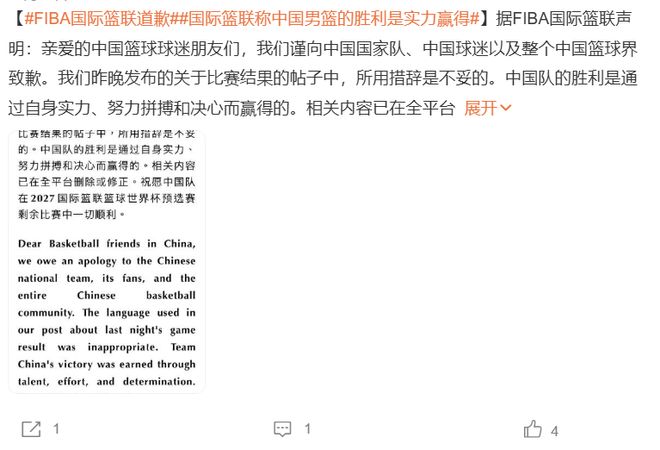 而在昨天晚上,國際籃聯再次向中國男籃、球迷進行了一次隆重的道歉。不過,國際籃聯道歉的真實原因并非裁判的爭議執法,而是他們自身的用詞錯誤。這一道歉,顯然難以讓中國球迷接受。